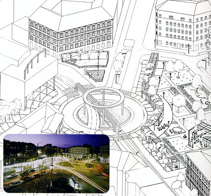A “voliére" over the pedestrian Treustraße makes the square more attractive as a streetball and calcetto area not only for children and young people.